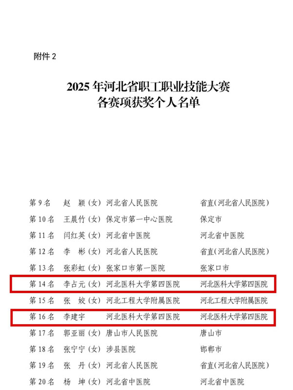 近日,由河北省总工会、河北省人力资源和社会保障厅、河北省卫生健康委员会联合主办的河北省老年医疗护理技能竞赛落幕。由重症医学科高鹏、李建宇,消化内科李亚楠和东院急诊科李占元组成的我院护理代表队,经过理论考试、基础操作、案例操作三个环节考核,在与全省63支代表队近300名选手同台竞技中脱颖而出,获得团体总分第二名。李占元、李建宇两名选手凭借优异表现成功跻身个人成绩前20名。