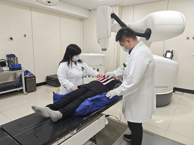 同时,射波刀机房每日高效完成多例肿瘤治疗。团队采用金标追踪与呼吸追踪相结合的双重精准定位技术,实现对病灶的动态锁定与精准照射,最大程度降低正常组织受照风险。工作人员全程细致指导、密切监护,以专业与暖心赢得患者及家属一致认可。